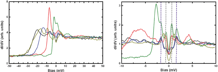 dI/dV-Spektren einer 9 – 25 nm hohen Ag-Insel auf Nb (110) bei T = 0,9 K. Verschiedene Farben kennzeichnen unterschiedliche Positionen auf der Ag-Insel. In diesem Fall bildet sich ein Maximum an der unteren Oberflächenzustand-Bandkante aus, dessen Intensität wächst, je näher die Kante dem Ferminiveau ist. Darüber hinaus werden mehrere lokale Maxima innerhalb der Energielücke beobachtet, die möglicherweise auf die Bildung gebundener Andreev-Zustände aufgrund der kleinen Größe der Insel zurückzuführen sind.
