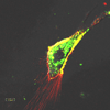 Induktion von Apoptose durch TNF-gekoppelte Nanocytes. Nanocytes von 1 µm Durchmesser (rot fluoreszierend markiert) wurden auf eine Zelle gegeben (grün fluoreszierend markiert), die völlig resistent gegen sTNF, aber sensitiv gegenüber memTNF ist. Bereits nach 40 min ist die Zelle abgetötet, erkennbar am typisch apoptotischen Phänotyp.